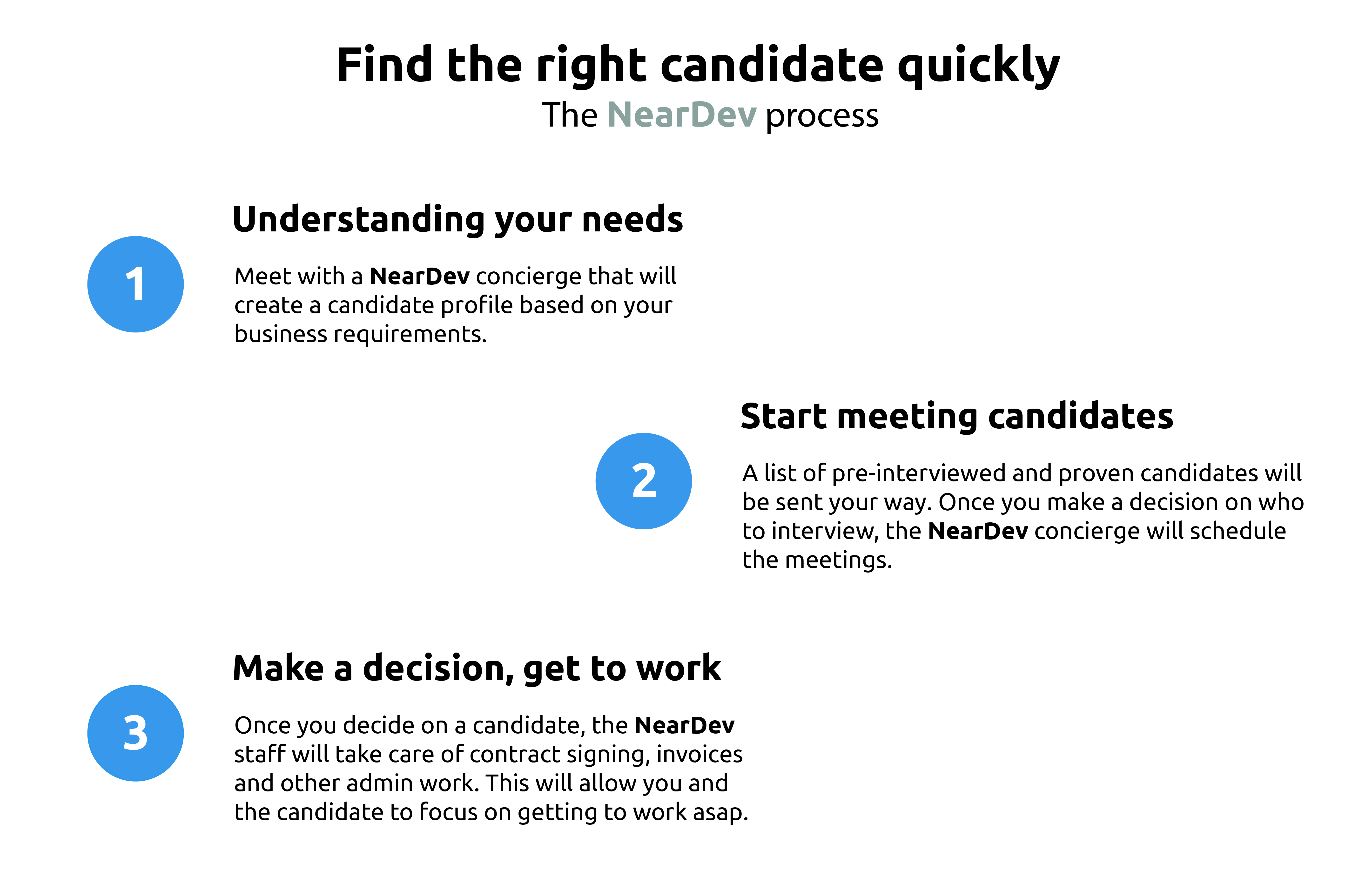 At NearDev we have a deep understanding of what the software development cycle encompasses and know the right technical skills needed to perform correctly on the job. We are continuously searching for the market´s top talent and work to match candidates with the right position. In order to do this, we do a comprehensive screening of the candidate, evaluating their skill set through coding challenges and validating their knowledge of software development & quality assurance fundamentals. We make sure that once the client company is ready to meet the candidate, they will encounter someone qualified to take on the job should they make the decision to hire them.